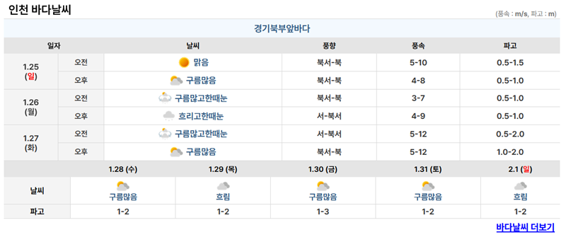 바다날씨 예보는 표 형태로 정리되어 있어 한눈에 파악하기 좋아요. 예를 들어, 제가 보고 있는 1월 25일 오전에는 날씨가 맑고, 북서-북 방향의 바람이 초속 5~10미터로 불며, 파고는 0.5~1.5미터라는 것을 바로 알 수 있죠. 이렇게 며칠간의 예보를 미리 확인하고 여행 계획을 세울 수 있어요.