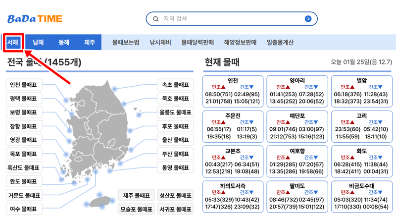 서해바다의 상세한 정보를 확인하기 위해, 먼저 검색을 통해 '바다타임' 홈페이지에 접속해 주세요. 홈페이지에 들어가면 우리나라 지도와 함께 동해, 남해, 서해 등 권역을 선택하는 화면이 가장 먼저 보여요. 우리는 서해의 정보가 필요하니, 좌측 상단에 있는 '서해' 메뉴를 선택해서 다음 단계로 넘어가 볼게요.