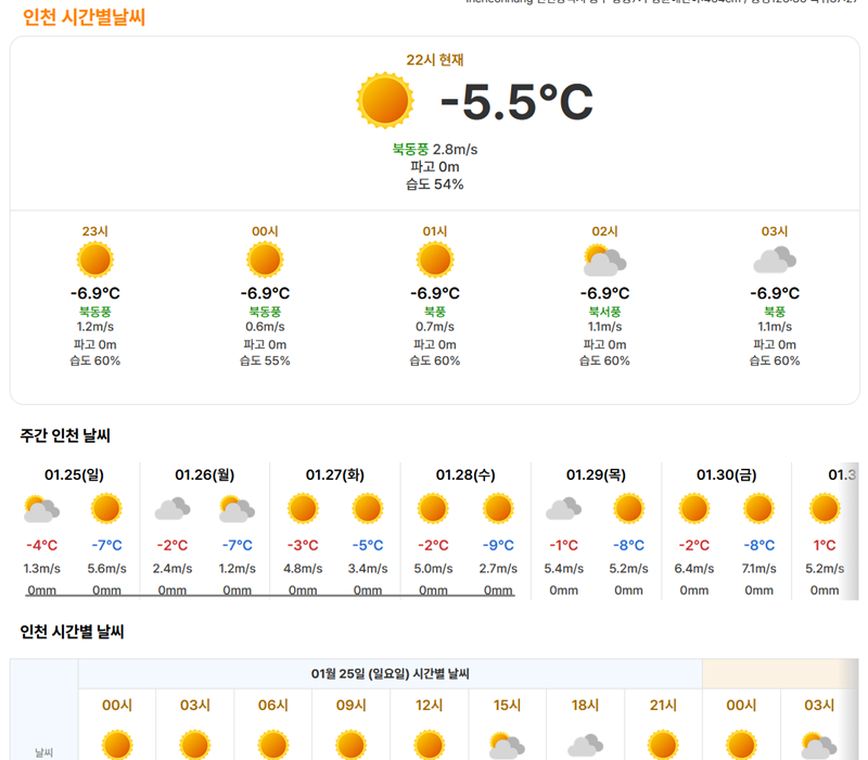 그날의 더 상세한 날씨 변화가 궁금하다면 '인천 시간별날씨'를 확인해 보세요. 3시간 간격으로 날씨와 기온, 풍향, 풍속, 파고, 습도, 강수량까지 아주 구체적인 정보를 제공해요. 덕분에 하루 중 언제가 바다 활동을 하기에 가장 좋은 시간대인지 판단하기가 훨씬 수월해져요.