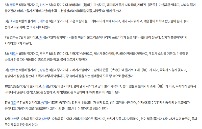 설명은 열두 달, 스물네 개의 절기 모두에 대해 빠짐없이 이어졌습니다. 소만에는 씀바귀가 뻗어 나오고, 백로부터는 기러기가 날아오기 시작한다는 등, 각 시기별 동식물의 변화까지 세세하게 기록되어 있어 자연의 순리를 더욱 깊이 느낄 수 있었습니다.