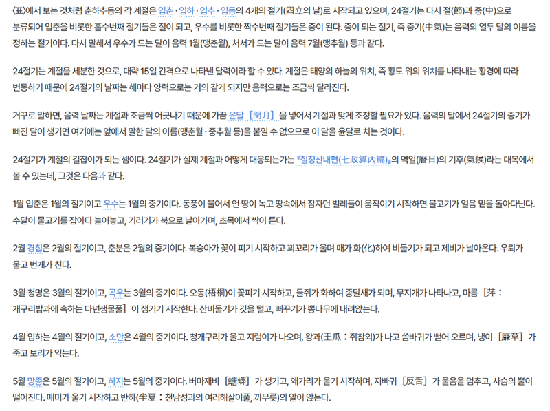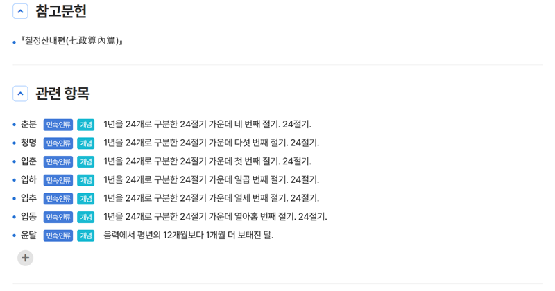모든 설명이 끝난 뒤에는 '참고문헌'과 '관련 항목'이 정리되어 있었습니다. 이를 통해 정보의 출처를 확인할 수 있었고, 춘분이나 입동처럼 특정 절기에 대해 더 깊이 알고 싶을 때 참고할 수 있도록 되어 있어 매우 유용하다고 생각했습니다.
