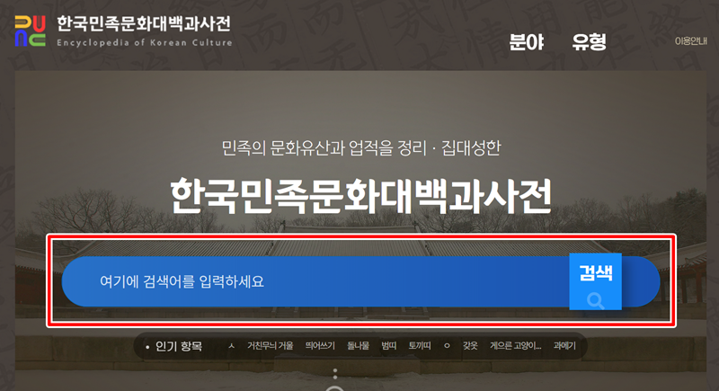 가끔 뉴스에서 '오늘은 절기상 OOO입니다'라는 말을 들을 때마다 정확한 뜻이 궁금해지곤 합니다. 그래서 저는 가장 신뢰할 수 있는 정보를 찾기 위해 '한국민족문화대백과사전' 홈페이지를 검색해 열었습니다. 홈페이지에 들어서자마자 보이는 큼지막한 검색창에 궁금했던 내용을 바로 입력할 수 있었습니다.