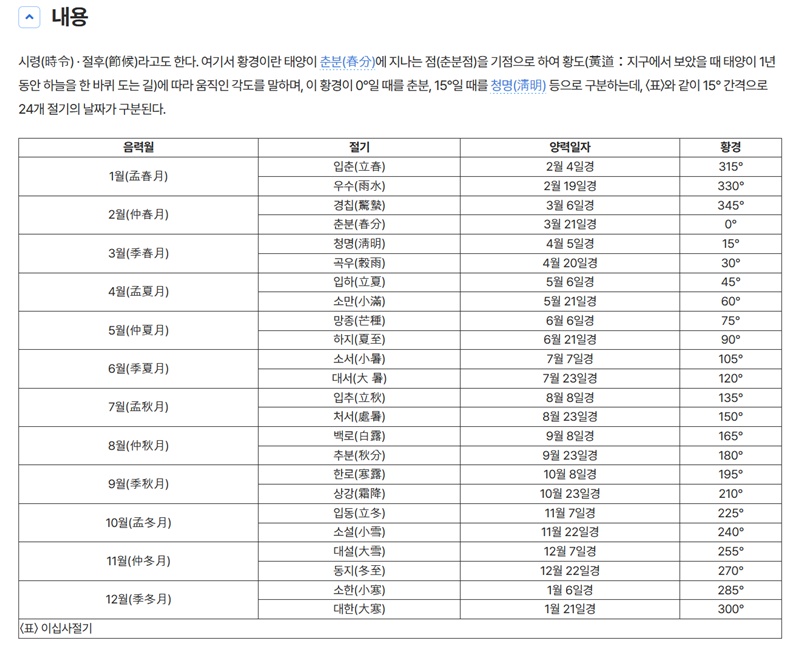 스크롤을 조금 내리자 제가 가장 찾고 싶었던 24절기 표가 한눈에 들어왔습니다. 이 표에는 각 절기의 이름은 물론, 해당하는 음력월과 양력 날짜, 그리고 태양의 위치를 나타내는 황경까지 상세하게 정리되어 있었습니다. 덕분에 1년의 흐름을 계절별로 명확하게 이해할 수 있었죠.