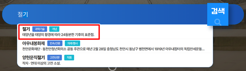검색창에 '절기'라고 입력하자, 마치 제 마음을 읽은 것처럼 바로 아래에 관련된 검색 결과가 미리 나타났습니다. 그중에서도 가장 위에 있는 '절기' 항목을 보니 '태양년을 태양의 황경에 따라 24등분한 기후의 표준점'이라는 명확한 설명이 덧붙여져 있어 망설임 없이 선택했습니다.