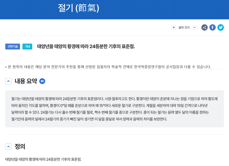 해당 항목으로 들어가니, 좀 더 자세한 내용이 저를 반겨주었습니다. 가장 위에는 다시 한번 절기의 정의가 나와 있었고, 그 아래 '내용 요약' 부분에서는 절기가 무엇인지, 왜 중요한지에 대한 핵심적인 설명이 알기 쉽게 정리되어 있어 전체적인 개념을 파악하는 데 큰 도움이 되었습니다.