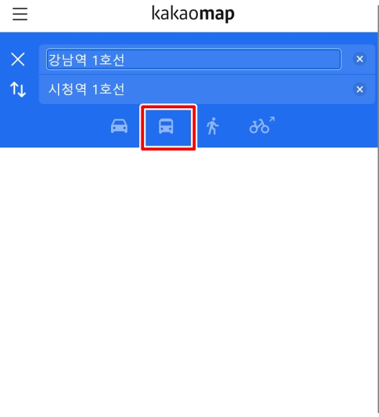 목적지를 적고 나면 여러 가지 이동 수단 중에서 하나를 골라야 하는데 저는 버스와 기차가 함께 그려진 대중교통 모양의 아이콘을 선택했답니다. 이렇게 하면 지금 내가 서 있는 곳에서부터 목표 지점까지 갈 수 있는 모든 전철 노선과 연계 정보를 한꺼번에 불러와서 보여주더라고요.