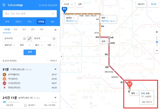 모든 조건을 입력하고 확인을 해보니 화면에 최적의 경로와 함께 우리가 가장 궁금해하는 소요 시간과 카드 이용 금액이 아주 선명하게 나타났어요. 삼각지역에서 정자역까지 이동할 때 오십 일분 정도가 걸리고 삼천 육백 오십 원이 든다는 사실을 미리 알게 되니 마음이 한결 여유로워졌답니다.