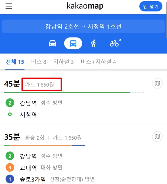 목적지를 적고 나면 여러 가지 이동 수단 중에서 하나를 골라야 하는데 저는 버스와 기차가 함께 그려진 대중교통 모양의 아이콘을 선택했답니다. 이렇게 하면 지금 내가 서 있는 곳에서부터 목표 지점까지 갈 수 있는 모든 전철 노선과 연계 정보를 한꺼번에 불러와서 보여주더라고요.