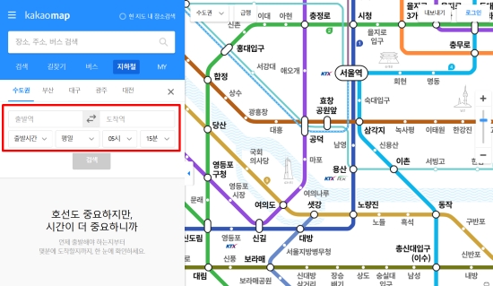 다음으로는 내가 출발할 역과 도착할 지점을 빈칸에 정확하게 적어 넣어주면 되는데요. 저는 평일이나 주말 같은 운행 날짜는 물론이고 실제 지하철을 타게 될 시간대까지 아주 세밀하게 설정해 보았어요. 시간 설정에 따라 첫차나 막차 시간까지 연계해서 볼 수 있어서 일정을 짜기에 정말 편리하더라고요.