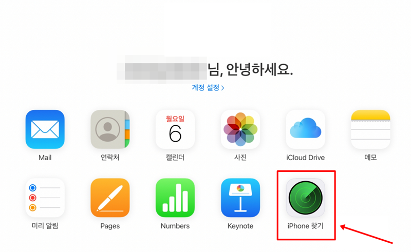 5. 로그인이 완료되면 메일, 연락처, 사진 등 다양한 아이콘들이 나열된 메뉴 화면을 볼 수 있습니다. 여기서 레이더 모양의 아이폰 찾기 아이콘을 찾아 선택하면 됩니다. 이 기능은 지도 위에 내 기기들의 위치를 실시간으로 보여주며 분실 시 원격으로 제어할 수 있는 기능들을 포함합니다.