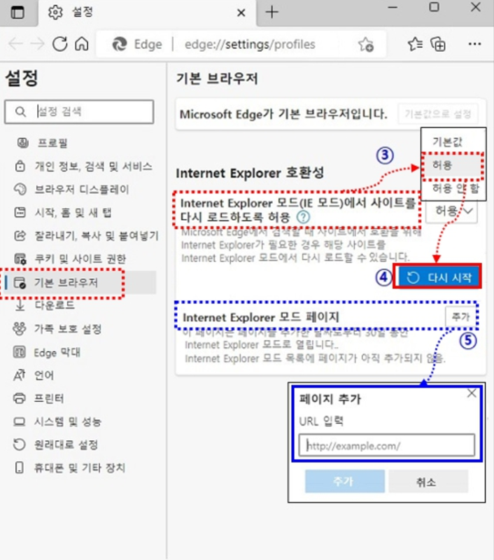 왼쪽 메뉴들 중에서 기본 브라우저라는 글자를 찾아서 누르면 호환성을 조절할 수 있는 칸이 나타나요. 여기서 허용이라는 글자를 선택하고 빨간색으로 강조된 다시 시작을 눌러야 바뀐 내용이 제대로 반영된답니다. 저도 이 단계를 거치고 나서야 비로소 예전 화면들이 부드럽게 돌아가는 것을 확인할 수 있었어요. 기기가 다시 켜지는 동안의 짧은 기다림이 기대감으로 변하는 순간이었답니다.