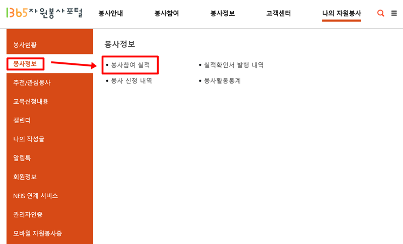 지도가 펼쳐지듯 다양한 메뉴가 나타나면 왼쪽 날개 부분에 있는 봉사정보라는 항목을 찾아보세요. 그 아래에 숨어있는 봉사참여 실적이라는 글자를 정성껏 선택하면 되는데, 마치 보물찾기를 하는 기분이 들어서 설레더라고요. 내가 그동안 땀 흘리며 이웃과 나눈 소중한 시간들이 이곳에 모두 모여있다고 생각하니 벌써부터 마음이 훈훈해지는 것을 느낄 수 있어요.