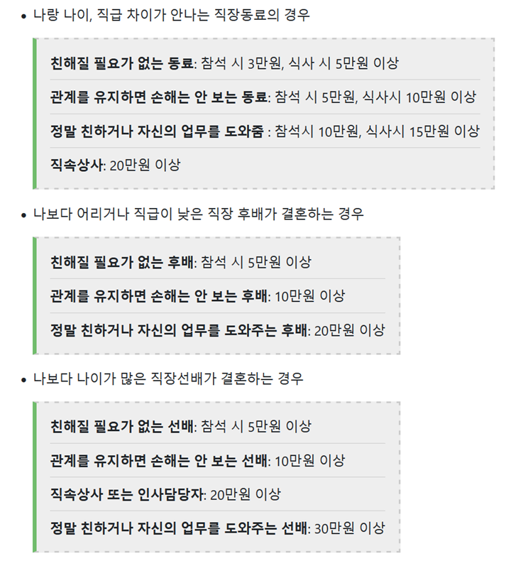 매일 마주치는 직장 동료들의 경조사는 관계 유지의 핵심이라 더 신경이 쓰일 수밖에 없더라고요. 직급이 비슷한 동료라면 식사 여부에 따라 5만 원에서 10만 원 사이를 조절하면 되고 업무를 도와준 고마운 사이라면 10만 원 이상이 기본이에요. 특히 나보다 높은 직속 상사라면 20만 원 이상을 생각하는 게 앞으로의 원만한 회사 생활을 위해 현명한 선택이라는 걸 배웠답니다.