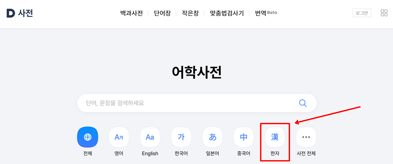 저는 모르는 한자가 생기면 바로 인터넷 검색창을 열어 다음 사전 홈페이지를 찾아 들어가요. 홈페이지에 접속하면 다양한 언어 사전들이 보이는데, 이 중에서 저는 제가 찾으려는 한자를 검색하기 위해 '한자'라고 쓰인 아이콘을 눌러 한자사전으로 이동했습니다.