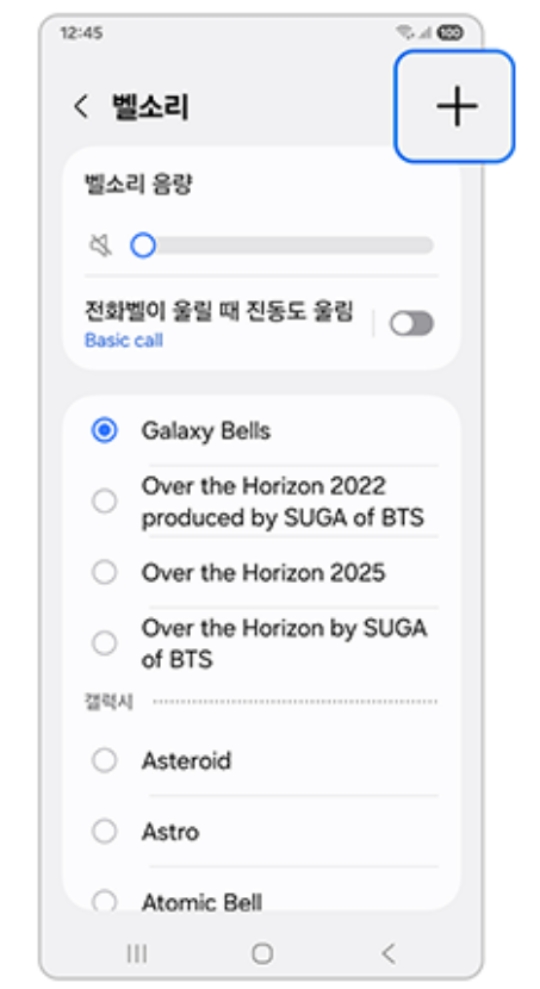 이제 다양한 벨소리 목록이 눈앞에 펼쳐집니다. 휴대폰에 기본적으로 들어있는 여러 가지 소리들이죠. 하지만 우리는 나만의 음악을 설정하고 싶으니, 이 목록들을 그냥 지나쳐 주세요. 화면 오른쪽 위에 작게 보이는 '+' 모양의 버튼이 바로 내 휴대폰에 저장된 음악 파일을 불러오는 기능이랍니다.