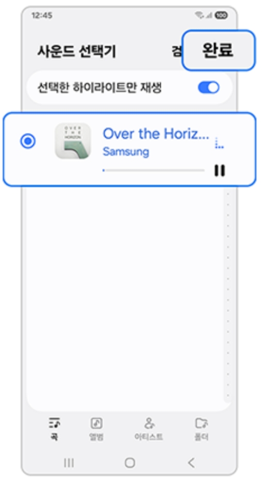 '+' 버튼을 누르면 내 휴대폰에 저장된 음악 목록이 나타나는 '사운드 선택기' 화면으로 넘어가요. 여기서 내가 벨소리로 지정하고 싶은 노래를 찾아서 선택하면 됩니다. 노래를 선택한 후 오른쪽 위에 있는 '완료' 버튼을 누르면, 이제부터 모든 전화는 이 노래로 울리게 될 거예요.