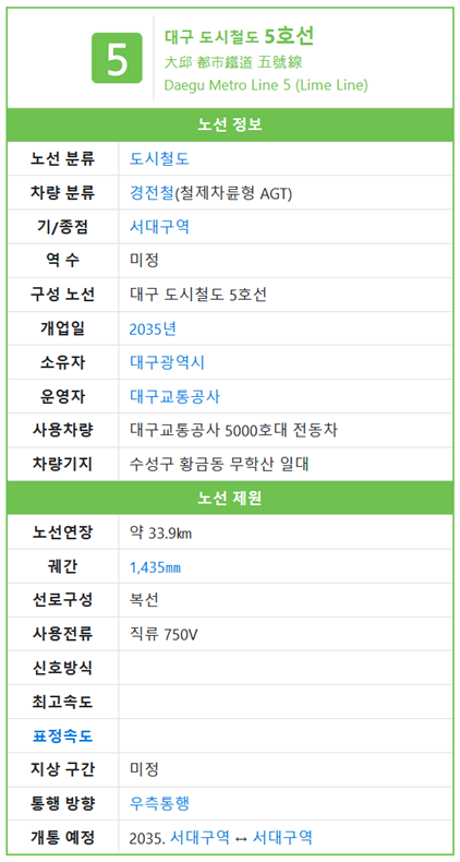새로운 노선 계획을 처음 들었을 때는 막연하게만 느껴졌어요. 그래서 어떤 모습일지 궁금해서 직접 찾아봤는데요. 가장 먼저 눈에 띈 것은 '대구 도시철도 5호선'의 기본 정보였어요. 라임 라인(Lime Line)이라는 이름으로 불릴 5호선은 2035년 개통을 목표로 하는 경전철(AGT) 방식이에요. 무엇보다 중요한 특징은 시작과 끝이 같은 '순환선'이라는 점이에요. 서대구역을 기점으로 대구 시내 주요 거점을 한 바퀴 도는 형태로, 도시 전체의 교통 흐름을 원활하게 만들어 줄 것으로 기대돼요. 총 길이는 약 33.9km에 달한다고 하네요.