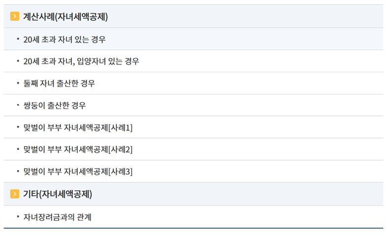 이론만으로는 내 상황에 어떻게 적용될지 감이 잘 안 올 수 있어요. 그럴 땐 실제 사례를 참고하는 게 최고더라고요. 해당 페이지 하단을 보면 '계산사례'라는 부분이 있어요. 여기에는 20세 초과 자녀가 있는 경우, 쌍둥이를 출산한 경우, 맞벌이 부부의 경우 등 정말 다양한 상황별 예시가 자세하게 설명되어 있어요. 본인과 비슷한 사례를 찾아보면 공제 금액을 어떻게 계산해야 할지 훨씬 명확하게 이해할 수 있을 거예요.