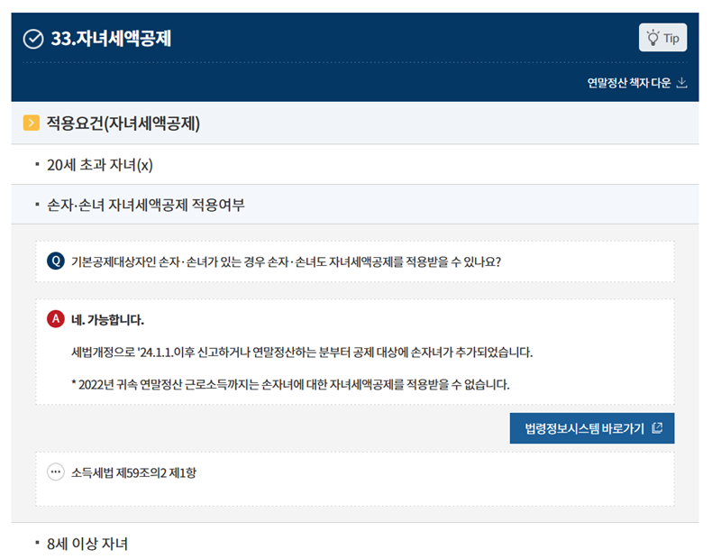 Q&A 목록을 쭉 내려보면서 우리에게 필요한 항목인 '33.자녀세액공제'를 찾아보세요. 여기서 가장 먼저 확인해야 할 기본 중의 기본은 바로 나이 요건이에요. 많은 분들이 헷갈려 하시는데, 자녀가 만 20세를 초과하면 기본공제대상자에 해당하지 않기 때문에 자녀세액공제를 받을 수 없다는 점을 꼭 기억해야 해요. 저도 저희 아이가 성인이 되었을 때 이걸 놓치고 신청할 뻔한 아찔한 경험이 있답니다.