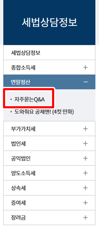 이제 거의 다 왔어요. '세법상담정보'를 누르면 화면이 바뀌면서 다양한 세금 종류가 나오는데요. 우리는 연말정산이 궁금한 거니까, 중간쯤에 있는 '연말정산' 항목을 찾아주세요. 그리고 그 바로 아래에 있는 '자주묻는Q&A'로 들어가면 돼요. 이곳에는 사람들이 연말정산에 대해 가장 많이 물어보는 질문과 그에 대한 답변이 정말 잘 정리되어 있어요. 하나씩 읽어보는 것만으로도 웬만한 궁금증은 다 해결될 정도랍니다.