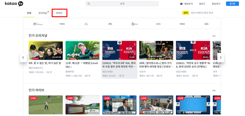 1. 카카오TV 홈페이지 상단에는 '전체', '오리지널', '라이브' 세 가지 메뉴가 있습니다. 이 중에서 실시간 방송을 보기 위해 가운데에 있는 '라이브' 항목을 선택해서 들어가 주세요. 다양한 생방송 콘텐츠들이 준비되어 있습니다.