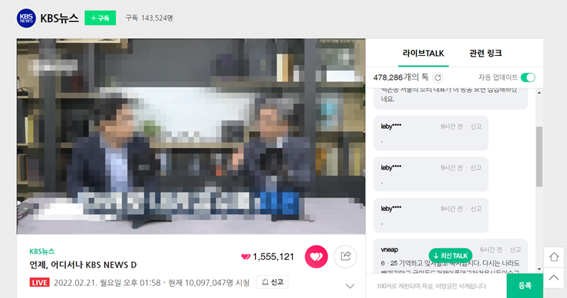 7. 네이버TV에서도 마찬가지로 원하는 방송을 선택하면 바로 시청이 가능합니다. 영상 옆에는 실시간으로 시청자들과 소통할 수 있는 채팅창이 마련되어 있어 방송을 보면서 다른 사람들과 함께 이야기를 나누는 재미도 느낄 수 있어요.