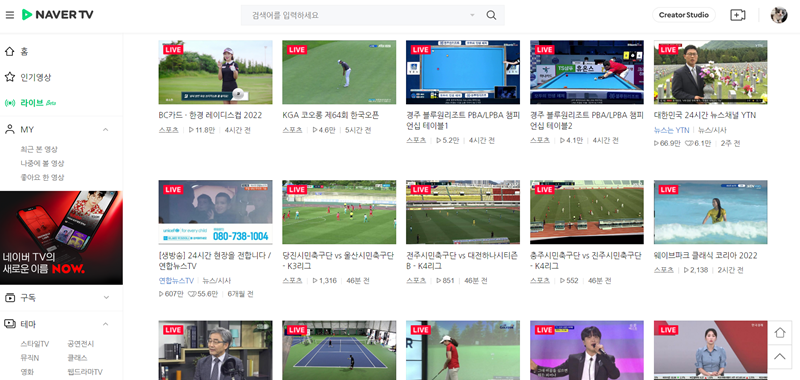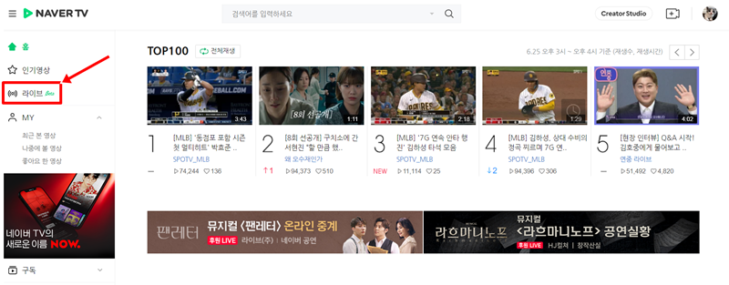 5. 카카오TV 외에 네이버TV를 통해서도 실시간 방송을 볼 수 있습니다. 네이버TV 홈페이지에 접속한 뒤 왼쪽 메뉴 목록을 살펴보면 '라이브'라는 항목이 보일 거예요. 이 부분을 통해 현재 진행 중인 라이브 방송들을 만날 수 있습니다.