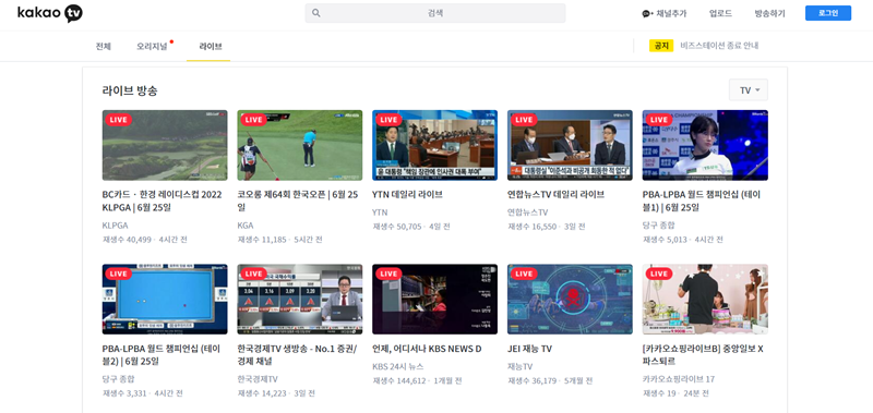 별도의 유료 서비스에 가입하지 않아도 인터넷을 통해 지상파나 종편 등 다양한 방송 채널의 실시간 프로그램을 감상할 수 있는 곳이에요. 뉴스, 드라마, 스포츠 중계까지 본방송 시간에 맞춰 생생하게 즐길 수 있답니다. '인터넷 tv 실시간 무료시청 사이트'는 카카오TV 홈페이지에서 이용해 볼 수 있습니다.