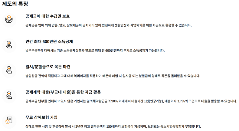 제도의 특징을 살펴보니 이게 바로 장점이구나 싶었어요. 가장 큰 것은 내가 낸 공제금이 법적으로 압류, 양도, 제공이 금지되어 있어서 어떤 상황에서도 안전하게 지킬 수 있다는 점이에요. 여기에 연간 최대 600만 원까지 소득공제도 해주고, 내가 낸 돈은 복리이자로 불어나죠. 심지어 급하게 자금이 필요할 때를 대비한 자금 활용 방안이나 무료 상해 지원까지, 혜택이 정말 다양했어요.