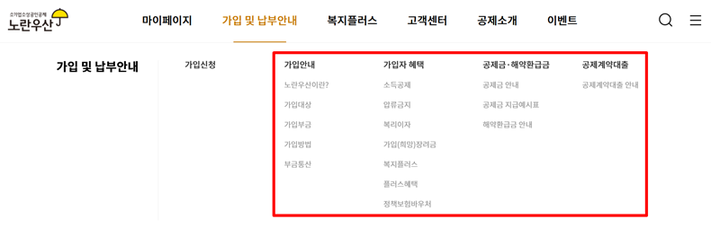 이 제도가 도대체 무엇인지, 어떤 혜택이 있는지 알아보기 위해 가장 먼저 노란우산공제 사이트를 찾아 들어가 봤어요. 여러 메뉴 중에서 자연스럽게 '가입 및 납부안내'라는 곳에 시선이 가더라고요. 아무래도 가입하기 전에 어떤 내용인지부터 알아야 하니까요. 여기가 모든 정보를 확인하는 시작점이었어요.