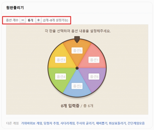 원판이 보이면 가장 먼저 해야 할 일은 몇 개의 칸으로 나눌지 정하는 거예요. 화면 위쪽에 '옵션 개수'라는 부분이 있는데, 여기서 '-'와 '+'를 이용해서 칸 수를 조절할 수 있어요. 최소 2개부터 최대 8개까지 설정이 가능하니, 상황에 맞게 선택지의 개수를 정해주시면 돼요.