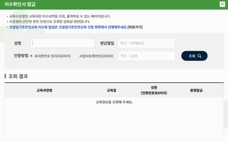 버튼을 선택하면 성명과 생년월일을 입력하는 창이 나올 거예요. 저도 처음에 당연히 여기에 제 정보를 넣었는데, 자세히 보니 위에 작은 글씨로 중요한 안내문이 있더라고요. 우리가 필요한 건설업 기초안전교육 이수증은 여기서는 발급이 안 되고, 별도 신청 화면으로 가야 한다는 내용이었어요. 여기서 '바로가기'를 선택해서 넘어가야 헛걸음하지 않아요.