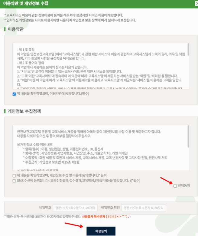 본인 확인을 마치면 이용약관 동의 절차가 나와요. 조금 길고 복잡해 보이지만, 내용을 확인하고 필수 항목들에 체크한 뒤 맨 아래에 있는 '이용동의' 버튼을 선택하면 간단하게 다음으로 넘어갈 수 있어요. 저는 보통 '전체동의'에 체크하는데, 그러면 한 번에 해결되니 더 편하더라고요.