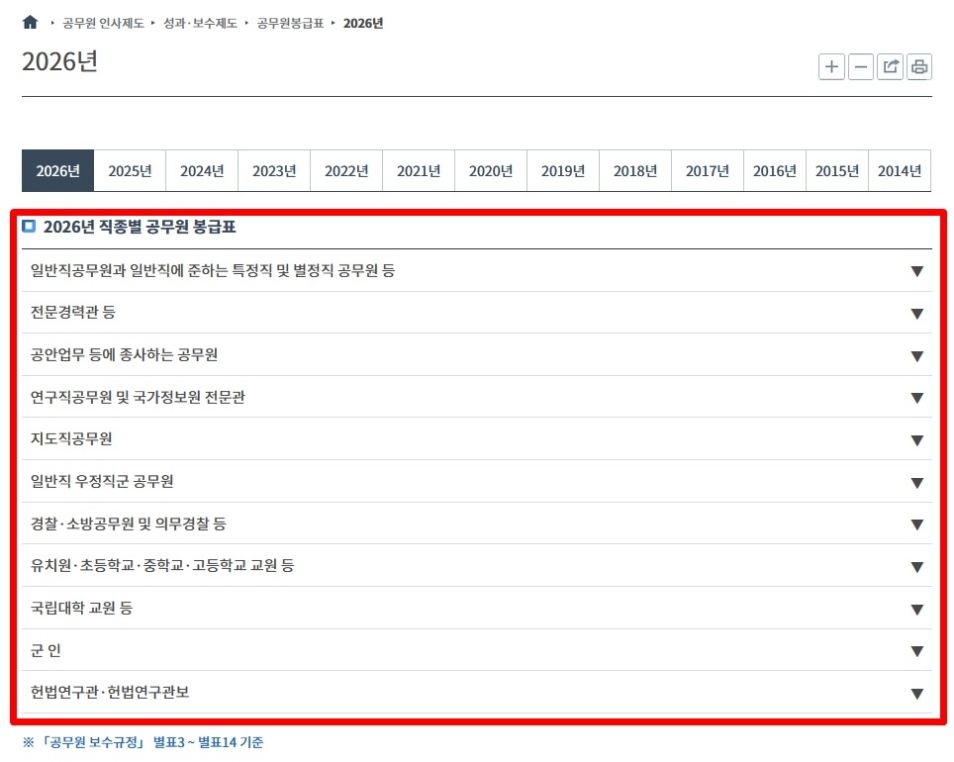 이제 연도별 공무원 봉급표를 확인할 수 있는 화면이 나와요. 여기서 최신 연도를 선택하면, 그 아래로 '직종별 공무원 봉급표' 목록이 쭉 나옵니다. 일반직, 경찰, 소방, 교원 등 다양한 직렬이 있으니, 본인이 해당하거나 관심 있는 직종을 선택해서 세부 내용을 확인할 수 있어요.
