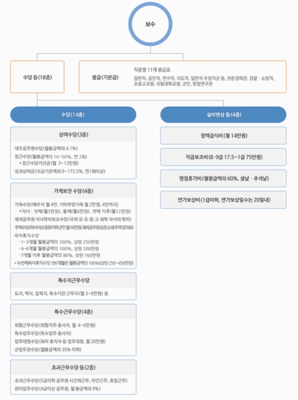 이 그림을 보면 공무원의 보수 체계를 한눈에 이해할 수 있어요. 전체 보수는 우리가 확인한 기본급 성격의 '봉급'과 각종 '수당'으로 구성돼요. 수당에는 가족수당, 정근수당 같은 상여수당부터 정액급식비, 직급보조비 같은 실비변상금, 그리고 초과근무수당까지 정말 다양해요. 이 봉급과 수당들을 모두 합친 금액이 바로 세전 월급이 되는 거죠.