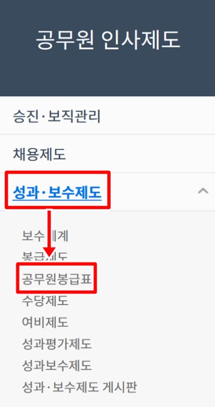 '공무원 인사제도'로 들어가면 왼쪽에 새로운 메뉴 목록이 나타나요. 여기서 우리는 월급이 궁금한 거니까, '성과·보수제도' 항목을 선택해 주세요. 그러면 그 아래로 하위 메뉴들이 펼쳐지는데, 가장 기본이 되는 월급표를 보기 위해 '공무원봉급표'를 선택해서 다음으로 넘어가면 됩니다.