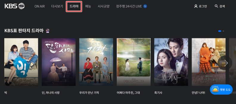 다시보기로 들어오셨다면 이제 보고 싶은 장르를 고를 차례예요. 뉴스, 시사교양 등 여러 가지가 있지만 우리는 드라마를 볼 거니까요. 상단 메뉴 중에서 '드라마'를 선택하면 KBS의 명작 드라마들이 쭉 나타나요. 현재 방영 중인 작품부터 사람들이 많이 찾는 인기작까지 한눈에 볼 수 있게 정리되어 있어서, 어떤 걸 볼지 고민될 때 둘러보기에도 좋았어요. 저는 여기서 예상치 못한 명작을 발견하기도 한답니다.