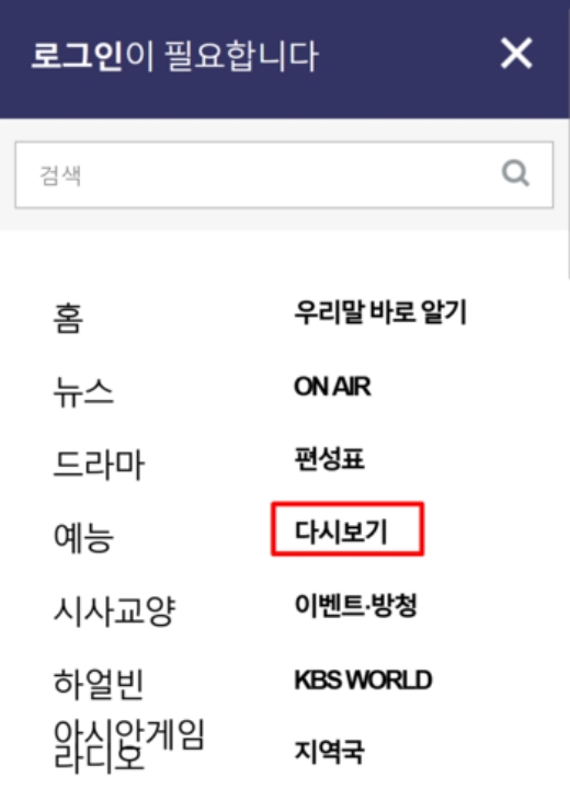 메뉴 아이콘을 선택하면 숨겨져 있던 전체 메뉴가 화면에 나타나요. 여기서 여러 항목들을 볼 수 있는데, 우리가 찾고 있는 건 '다시보기' 메뉴예요. PC에서와 마찬가지로 이곳에 모든 VOD가 모여있어요. '드라마'나 '예능' 같은 메뉴로 바로 들어갈 수도 있지만, '다시보기'를 통해 들어가는 게 종영된 프로그램까지 찾기에는 더 편한 것 같아요. 여기서 원하는 메뉴를 찾아서 들어가시면 됩니다.