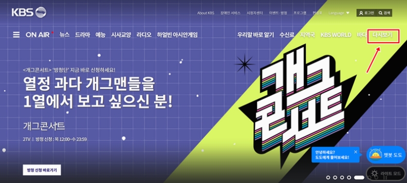 컴퓨터로 KBS 드라마를 다시 보려고 할 때가 많죠. KBS 사이트에 들어가면 상단에 여러 메뉴가 보여요. 여기서 다른 곳을 헤맬 필요 없이 바로 오른쪽에 보이는 '다시보기'라는 부분을 찾아서 들어가시면 돼요. 'ON AIR'나 '드라마' 같은 다른 메뉴들도 있지만, 종영된 프로그램을 포함한 모든 VOD는 여기에 모여있어서 이쪽으로 들어가는 게 가장 빠르고 정확하더라고요. 저도 처음엔 다른 곳을 둘러보느라 시간을 좀 썼어요.