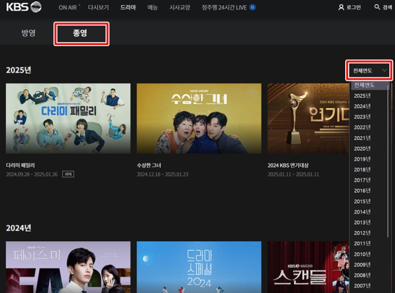 그럼 예전에 종영된 드라마는 어디서 찾을 수 있을까요? 드라마 메뉴에서 상단의 '종영' 부분을 선택해 보세요. 그러면 방송이 모두 끝난 드라마 목록만 따로 볼 수 있어요. 화면 오른쪽을 보면 '전체연도'라는 목록이 있는데, 여기서 원하는 방영 연도를 고르면 그 해에 방영했던 드라마들을 쉽게 찾을 수 있답니다. 2007년 드라마까지도 있어서, 정말 추억 여행하기에 딱 좋은 곳이에요. 저는 이걸로 옛날 드라마 찾아서 정주행하곤 해요.
