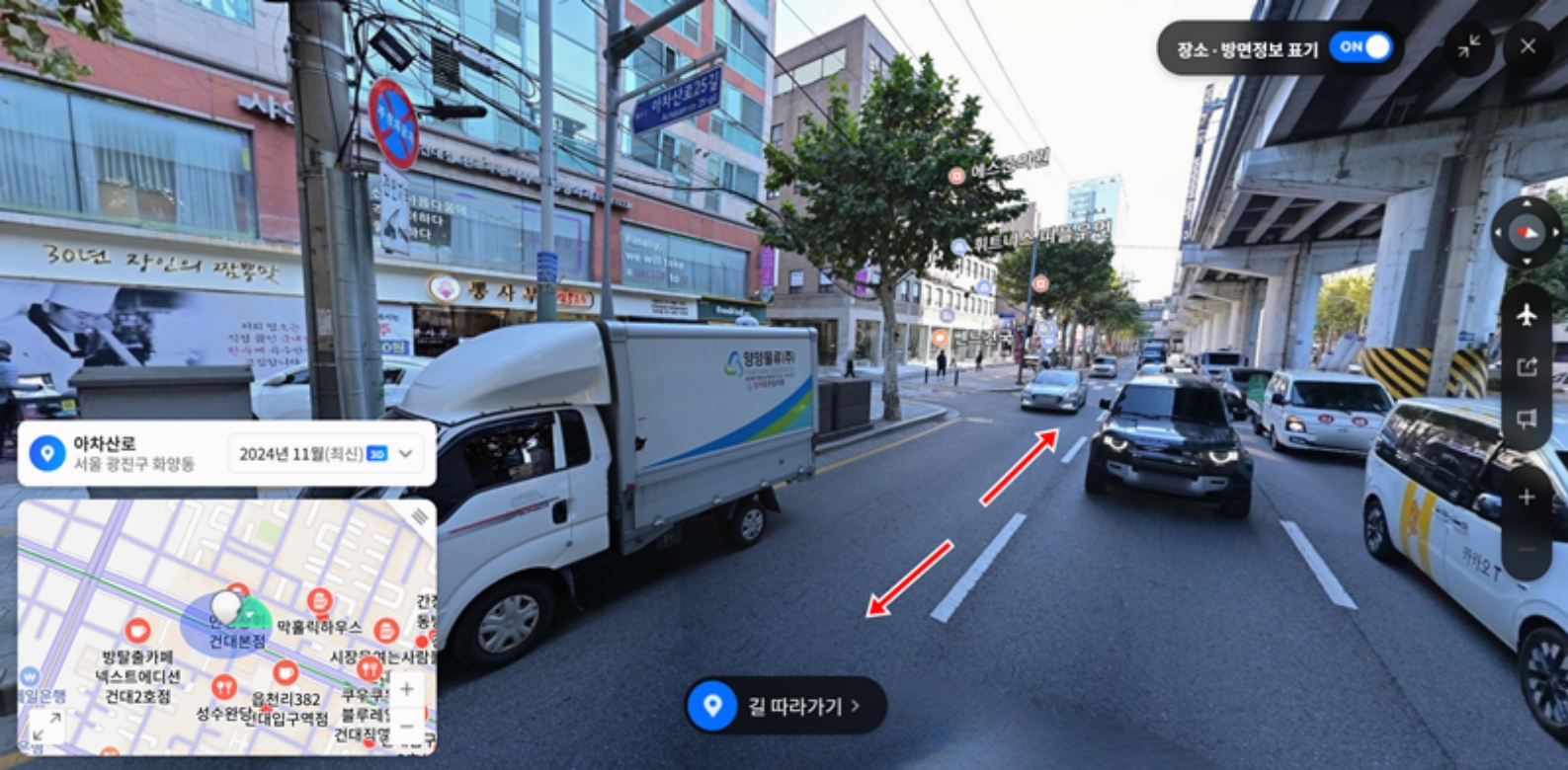 한곳에 멈춰 서서 보는 것뿐만 아니라, 거리를 따라 직접 이동도 가능해요. 화면 바닥에 하얀색 이동 방향 화살표들이 보이실 거예요. 이 화살표를 따라가면, 마치 동네를 산책하듯 가고 싶은 방향으로 계속 나아가며 주변을 탐색할 수 있습니다.