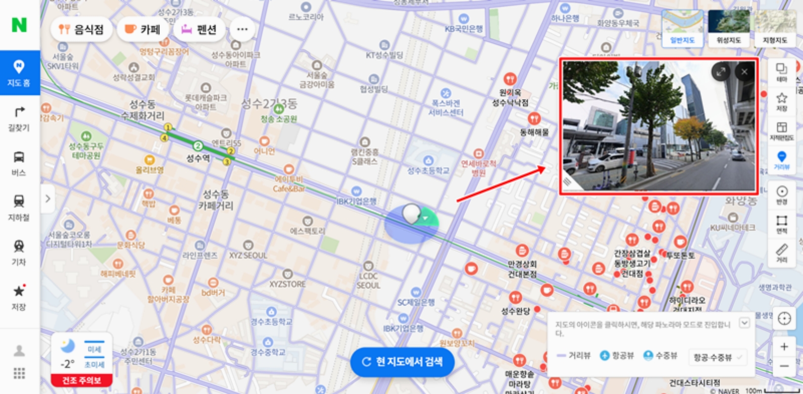 이제 보고 싶은 지점의 파란색 선 위로 마우스를 가져가 보세요. 그러면 그 위치의 실제 거리 모습이 작은 미리보기 창으로 나타납니다. 이 미리보기 창만으로도 주변 건물의 대략적인 모습을 파악할 수 있어 편리해요.