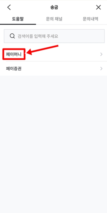 '송금' 카테고리 안에서도 '페이머니'와 '페이증권'으로 항목이 나뉘어 있어요. 우리가 보통 친구나 지인에게 보내는 돈은 '페이머니'에 해당하므로, '페이머니'를 선택해서 들어가면 송금 기록 삭제가 가능한지에 대한 공식적인 답변을 찾아볼 수 있습니다. 일반적으로 금융 거래 기록은 법적 효력 때문에 임의로 삭제할 수 없는 경우가 대부분이더라고요.