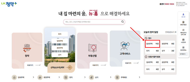 1. LH 청약플러스 홈페이지에 접속하면, '내 집 마련의 꿈'이라는 문구와 함께 다양한 주택 정보를 찾아볼 수 있습니다. 메인 화면에는 청약, 토지, 임대주택, 분양주택, 상가, 부동산 관련 활동 등 주요 항목들이 한눈에 들어옵니다. '접수' 항목에서는 현재 진행 중인 임대주택의 공고 수를 확인할 수 있습니다.