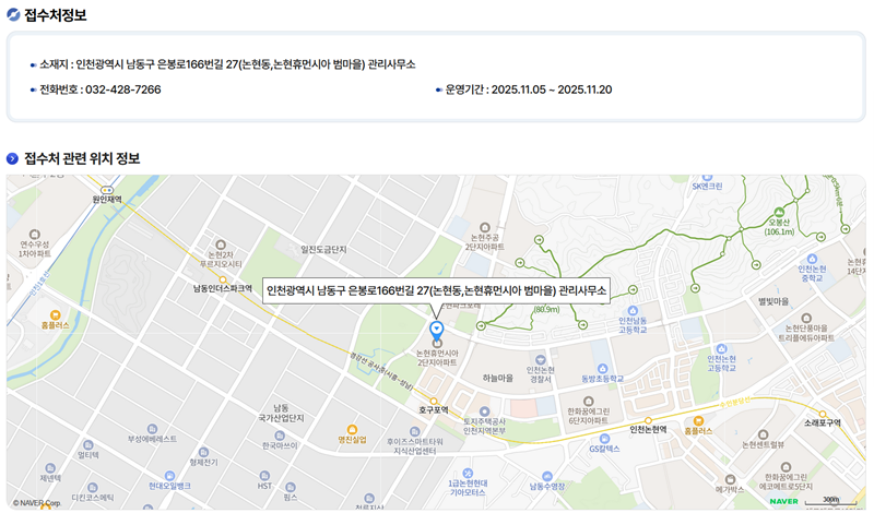 7. '접수 정보'에서는 해당 공고의 관리 사무소 소재지 주소와 문의 전화번호, 그리고 운영 기간을 상세하게 확인할 수 있습니다. 지도를 통해 관리 사무소의 위치를 정확하게 파악할 수 있어, 방문이 필요한 경우 편리하게 찾아갈 수 있도록 도와줍니다.