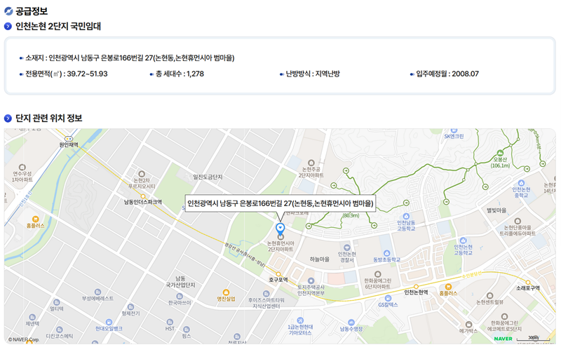 5. '공급 정보' 섹션에서는 해당 국민임대 단지의 정확한 소재지 주소와 전용 면적 범위, 총 세대수, 그리고 난방 방식 같은 핵심적인 정보를 지도와 함께 제공하여 주변 환경을 파악할 수 있도록 돕습니다.