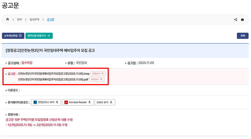 4. 특정 공고를 선택하면 해당 공고문 상세 화면으로 이동합니다. 여기에서는 공고의 접수 마감 여부, 유형, 공고일자 등 주요 정보가 요약되어 있으며, 가장 중요한 '공고문' 파일들을 .hwp 또는 .pdf 형식으로 내려받아 자세한 내용을 확인할 수 있습니다.