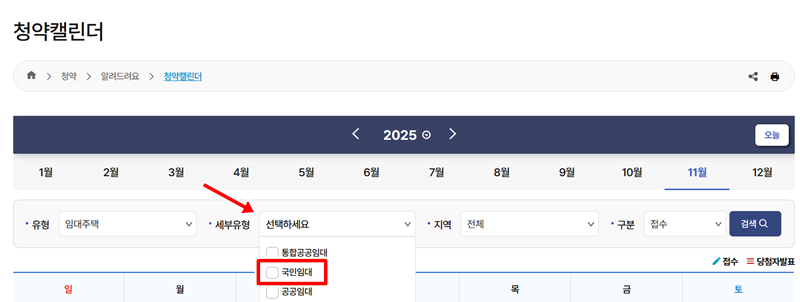 2. 청약 캘린더 화면으로 이동한 뒤, 달력에서 원하는 월을 선택하고 '유형'을 '임대주택'으로 설정합니다. 이어서 '세부유형'을 선택하는 부분에서 '국민임대' 항목을 선택하여 달력에 국민임대 관련 소식만 나타나도록 설정할 수 있습니다.