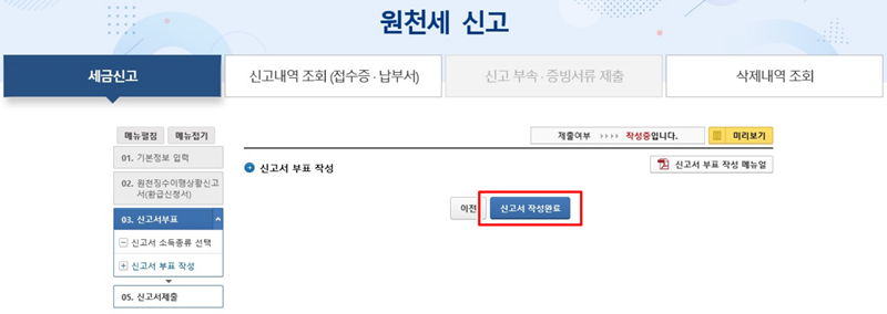 7. 신고서 부표 작성 단계까지 오면 사실상 신고 내용 입력은 거의 마무리된 것입니다. 기입한 내용에 오류가 없는지 검토한 후 '신고서 작성완료'를 눌러줍니다.