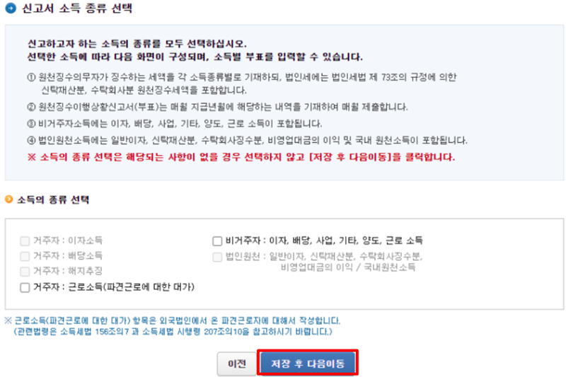 6. 신고서에 기재할 소득의 종류를 모두 선택하는 화면입니다. 근로소득, 퇴직소득, 사업소득 등 해당하는 모든 항목을 체크한 뒤 '저장 후 다음이동'을 선택합니다.